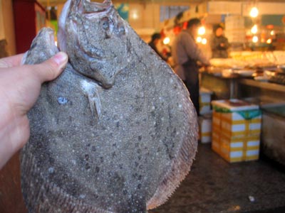 A shop owner (unseen) displays a a turbot, a popular type of flatfish, at a shop in Beijing November 21, 2006. The capital has banned the sales of the cancer-causing fish after some were found to contain carcinogens caused by chemical-laden feed in the wake of the sales ban in Shanghai and Shandong. [Newsphoto]
