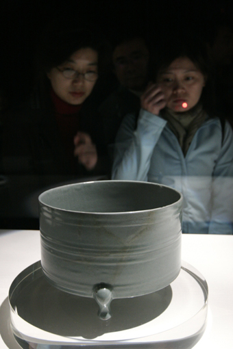 Visitors look at an antique pottery piece with light bluish-green glaze