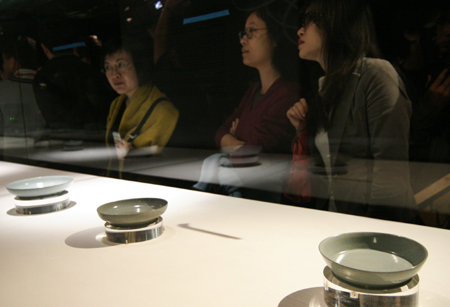 Visitors check out antique pottery pieces with light bluish-green glaze