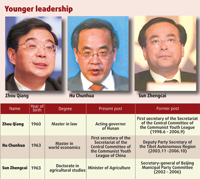 The 1960s group includes the 46-year-old Acting Governor of Hunan Zhou Qiang, the 44-year-old First Secretary of the Secretariat of the Central Committee of the Communist Youth League of China (CYLC) Hu Chunhua, and the 45-yea-old minister of the Ministry of Agriculture Sun Zhengcai. Zhou is the country's youngest provincial governor so far.