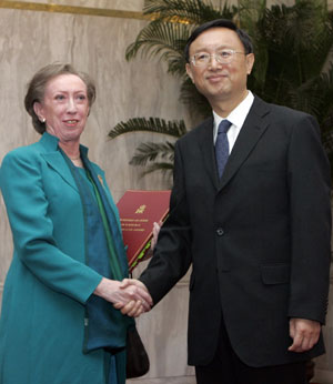 Yang's first public comment on the Darfur crisis in Sudan since taking office last month came as a campaign gathered steam to use the Olympics to put pressure on Beijing to do more to stop the violence. "On the Darfur issue, the position of the Chinese government is consistent and well known," Yang said. "We hope that this issue will be resolved properly through dialogue and negotiation." He added China believes "the political process and the peacekeeping operation should be promoted in a balanced manner". Yang told reporters China and the UK have agreed to launch consultations on the issues of South Asia and Africa in the near future. He spoke highly of the contributions of outgoing British Prime Minister Tony Blair has made in promoting the China-UK relationship, saying: "The Chinese government is looking forward to cooperating with the British government, led by the Labor Party with Gordon Brown as the new prime minister." Speaking at the news conference, Beckett said the Brown administration will continue to promote the development of China-UK relations. "He has been a very senior and very powerful figure in the British government for some 10 years. He strongly shares the view of Prime Minister Blair on the importance of relationship with China," she said. When asked about the stalled Six-Party Talks on the Korean Peninsula nuclear issue, Yang said the most pressing issue that needs to be resolved at the moment is the Democratic People's Republic of Korea -related fund in the Banco Delta Asia bank in Macao. "Relevant parties are making intensive efforts to seek a solution to the matter," Yang said. "We hope to see an early and proper settlement of that issue so that the process of the Six-Party Talks will continue." Yang also spoke about the upcoming second round of the Economic Strategic Dialogue between China and the United States next week in Washington. "We strongly believe that, as long as both sides make joint efforts to seek common interests and properly handle the frictions and differences in trade, the Sino-US economic relations will proceed further healthily," he said.  |