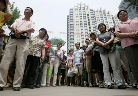 Parents wait for their children outside a school gate as students take the national college entrance exams in Beijing June 7, 2007. This year, a record 10 million Chinese youngsters will sit the two-day National College Entrance Exam, starting on Thursday, vying for about half that number of university places. [Reuters] |