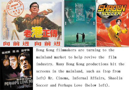 But while the money flows in, the local market continues to shrink. In 2006, the city's film industry struggled to churn out 51 productions, the number was 57 in 2005, but in its peak time there were about 300 films produced annually on the small island. At the same time, only 46 theaters are still running, one third of the number in the city's heyday. The territory still has stars recognized all over the world and award-winning directors, but for many insiders, the decline of the Hong Kong film industry started as early as the 1990s. "Hong Kong people are very diligent, that's part of Hong Kong spirit," says Samson Chiu, director of Golden Chicken (Jin Ji) and Mr. Cinema (Laogang Zhengzhuan). This diligence was apparent during the 1980s and 90s, when some films could be completed in one week. The films mainly featured crime, marital arts, ghosts, gambling, or soft pornography. If one type of film was a hit, such as Troublesome Night (Yinyang Lu) and Fight Back to School (Taoxue Weilong), numerous sequels would follow. Established actress Maggie Cheung earned the nickname "dozen Cheung", because she had the record of starring in a dozen of films in a year. The imitation of popular genres resulted in the production of low quality films, and consequently, the decline of Hong Kong film's reputation. Meanwhile, Korean films began to grab a slice of the Asian market rapidly. The gap between superstars like Jackie Chan and new blood widens year after year due to the shrinking market, which forces filmmakers to focus more on famous faces to find box office success. In addition, some directors, such as John Woo and Hark Tsui, chose to further their career in Hollywood at the end of the 1990s, accelerating the drain of production talent. Veteran producer and director Henry Fong Ping told a story he heard from a journalist. The reporter was overjoyed to interview a star that he had looked up to since he was a boy. But the joy vanished when he found he was interviewing the same person again and again. "Sometimes we feel safe, because the young men have not caught up yet," he says jokingly. "But if 10 years later, people are still talking about Chow Yun-fat and Andy Lau, it will be a sad thing for the industry," Fong says. "For the youngsters, my suggestion is, just do it. Do not sit and wait for a big production. Take every chance you can grab now." A ray of hope shone in 2004, when the Closer Economic Partnership Arrangement (CEPA) came into effect. Items related to the film industry in this package allowed Hong Kong filmmakers to distribute local films in the mainland on a quota-free basis, as opposed to falling under the foreign-film category and thus being subjected to the maximum-allowed quota of 20 foreign films a year. If a Hong Kong film is a co-production with the mainland, it gives the project automatic distribution across the vast country. But there must be content related to the mainland and the cast should include mainland actors. Hong Kong citizens are also allowed to own or operate theaters in the mainland. CEPA's impact is obvious. The mainland made about 330 films in 2006, but the top earners were co-productions with Hong Kong. These included Curse of the Golden Flower (Mancheng Jindai Huangjinjia) and The Banquet (Ye Yan), which ranked the first and second respectively. In Hong Kong, seven out of the top 10 films last year were co-productions with the Chinese mainland, according to the Motion Picture Industry Association of Hong Kong. In a Variety report, China's box office power was explained in this way: There were two major Chinese films released at Christmas - Curse of the Golden Flower and Confession of Pain, both are co-productions with Chinese mainland. Curse has brought in around $32.2 million from the mainland, and $2.6 million from Hong Kong. Confession is at $8.6 million in the mainland and $2.6 million in Hong Kong. Still, filmmakers say that there are problems with co-productions. For example, how do you make a story that appeals to both the mainland and Hong Kong, when Hong Kong culture is much more connected to south regions, which are quite different to northern China? Fong Ping has worked in the industry for about 30 years as actor, director and producer. Still, he finds it difficult to describe what kind of story would appeal to both groups. "I don't think I have found the right method to apply to every project. After all, the audience are very different," he says. What adds to the difficulty of choosing an appropriate story is the existence of censorship and non-existence of a rating system. In 2001, Hong Kong comedian and director Stephen Chow clashed with the movie bureau of the State Administration of Radio, Film and TV (SARFT) during the examination of Shaolin Soccer (Shaolin Zuqiu). Shaolin Temple complained about putting "soccer" alongside "Shaolin", which they worried would insult Buddhists. Chow refused to change the title to Kungfu Soccer, and the film's producer was banned from shooting on the mainland for one year. And in 2004, young director Ching-Po Wong's Left Hand (Jiang Hu) failed to hit the screens in the mainland because there were too many violent scenes. Aware of the difficulty of finding a subject that will please all, some are turning to the universality of human emotions. Samson Chiu's latest offering, Mr. Cinema, tells the story of a Hong Kong projectionist who has witnessed the past 40 years of the city. The typical Hong Kong grassroots' lifestyle resonates well with the local audience, while the feeling between husband and wife, father and son engages the mainland viewers too. When some are struggling to please the different audiences, others are worrying about the loss of Hong Kong flavor in the efforts to keep a balance. "Why must we recruit Xu Jinglei (a famed mainland actress) in Confession of Pain?" Fong said in a recent interview. "One is speaking mandarin, others Cantonese, and you have to explain why this person is speaking a di