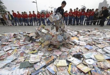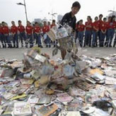 A staff member clears up pirated CDs and DVDs after they were destroyed during a campaign against piracy in Xiangfan, in central China's Hubei province in this April 26, 2007 file photo. [Reuters]