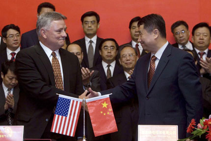 Tritch (L) shakes hands with Wang Binghua, Chairman of the State Nuclear