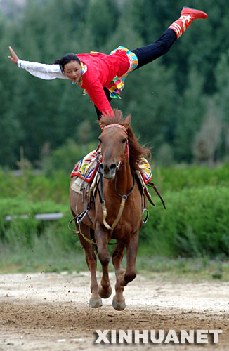 A member of the Tibetan equestrian sport team performs at the Shoton Festival in Lhasa, capital of southwest China's Tibet Autonomous Region on August 14, 2007. The Festival, which dates back to the 11th century as a religious activity for pilgrims to serve yogurt to monks and nuns who finished their summer retreat, had gradually become a theatrical event by mid-17th century. The Shoton Festival was inscribed on the list of China Intangible Cultural Heritage in May last year. [Xinhua]