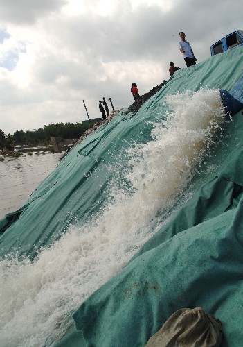 | People watch as water is pumped out of a flooded shaft at Huayuan Coal Mine into the Wenhe River in East China's Shandong Province on August 21, 2007. By 7:00 am Tuesday, the water level at the mine where 172 miners have been trapped since Friday had fallen by 23.6 meters to 69 meters. [Xinhua] |