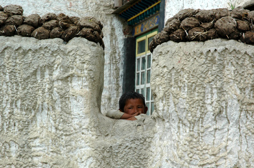A boy looks over the wall of his home near Jiangzi, in Southwest China's Tibet Autonomous Region, August 24, 2007. [chinadaily.com.cn]