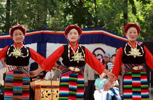 Folk dancers perform in Lhasa, Southwest China's Tibet Autonomous Region, August 26, 2007. [chinadaily.com.cn]