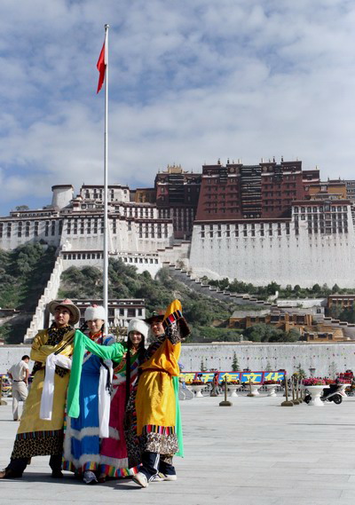 Updated: 2007-09-04 16:20 ![]() Tourists pose for a photo in front of the Potala Palace in Lhasa, Southwest China's Tibet Autonomous Region, August 22, 2007. [chinadaily.com.cn]