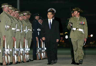 | President Hu Jintao (C) flanked by Australian military officers, heads to inspect an honour guard after landing in Canberra September 4, 2007. Hu is scheduled to attend the 15th Asia-Pacific Economic Cooperation Forum in Sydney on September 8-9. [Xinhua] |