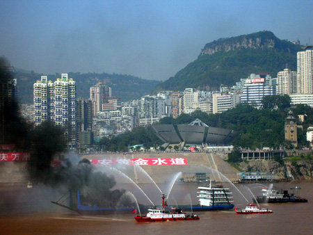Sponsored by the Ministry of Communications and Chongqing municipal government, the 2007 Yangtze Three Gorges Reservoir Joint Search and Rescue Manoeuvre was aimed at testing and demonstrating the country's emergency response capabilities along the Yangtze, the world's busiest river in terms of cargo transportation, said officials from the Ministry of Communications. Involving 22 departments such as maritime, navigation route, police, telecommunications, armed police, fire fighting, weather, health and shipping company, the 90-minute exercise displayed the rescue of passengers in case of a boat collision, extinguishing of fire and clearing of oil leaking into the river as a result of the collision, the search and arrest of two "terrorists" and removal of explosives installed on the boat by them, and the evacuation of passengers and boats from a site where an immense landslide was taking place.