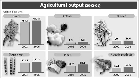 The quality of agricultural products has improved, the report said. The proportion of high-quality rice strains reached 69.1 percent in 2006. Wheat, corn and soybeans were 55.2 percent, 42 percent and 65.7 percent respectively.