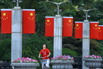 A cyclist raises his head to look at the national flags decorating Century Avenue in Shanghai on September 26, 2007. The flags have been put up on both sides of the 1-kilometer street, to celebrate the upcoming National Day on October 1. [newsphoto]