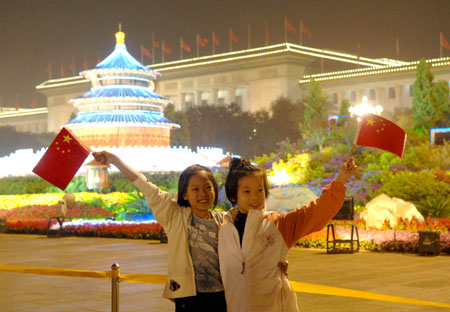 Two girls pose with small national flags on Tian'anmen Square September 30, 2007, the eve of the week-long National Day holiday. [Xinhua] |