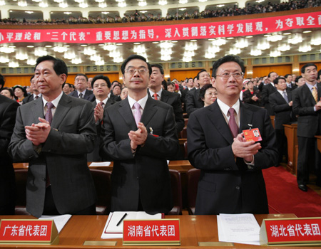 Delegates attend the party congress ![]() Delegates of the 17th National Congress of the Communist Party of China (CPC) applaud as CPC general secretary Hu Jintao delivers a speech during the opening of the 17th CPC National Congress, in Beijing, October 15, 2007. [Xinhua]