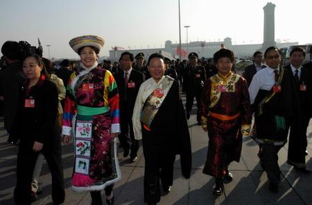 Delegates to the 17th National Congress of the Communist Party of China walk into the Great Hall of the People in Beijing to attend the closing session of the Party's national congress October 21, 2007. The Closing Session was started at 9:00 am on Sunday, at which a new CPC Central Committee and the Central Commission for Discipline Inspection would be elected. [Xinhua]
