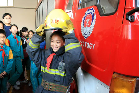A girl tries on a fire-protection suit at a base of local fire department in Jinan, East China's Shandong Province, November 5, 2007, the first day of the 16th National Fire Fighting Week. Eighty pupils from a primary school in Jinan visit the local fire department. [newsphoto]