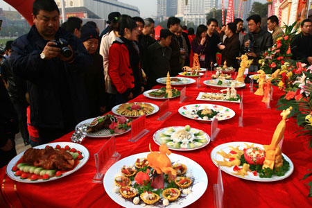 People view a variety of food displayed during the Lanzhou Food Festival, November 6, 2007. [newsphoto]