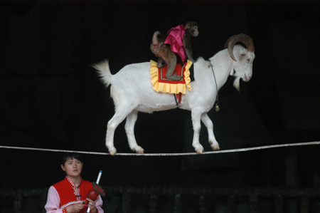 A monkey rides on the back of a goat which is walking a tight rope during a performance in Nanwan Monkey Island, November 24, 2007. Situated in Lingshui County, South China's Hainan Province, Nanwan Monkey Island is the only tropical nature reserve for macaques, a state protected animal in China. Nearly 2,000 live in this reserve. [newsphoto]