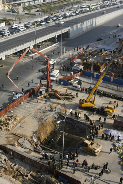 Workers try to fix a collapsed road in Beijing November 30, 2007. A road near one of the central business district's busiest intersections in the Chinese capital collapsed above a pedestrian tunnel Thursday night, leaving a house-sized crater and causing a major traffic jam. [Agencies]