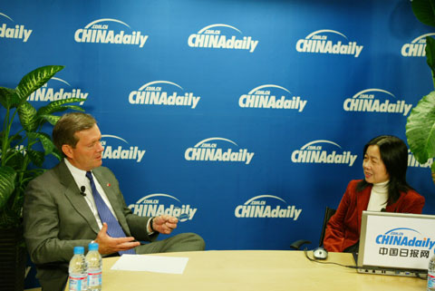 US Health and Human Services Secretary Mike Leavitt (L) is interviewed by Li Xing, chief of the International Department of China Daily at the chinadaily.com.cn office in Beijing December 10, 2007. Leavitt is in Beijing for the China-US Strategic Economic Dialogue. [chinadaily.com.cn] |