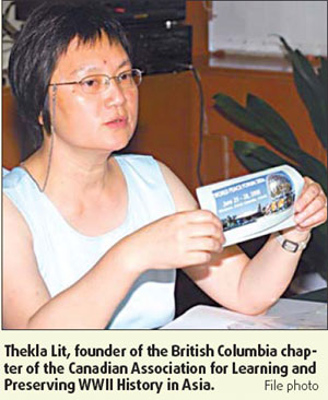 Updated: 2007-12-13 07:10 Thekla Lit does not appear to be a tough woman at first sight, but she has been resolute in making sure Japan's war-time record in China is never forgotten. When she was younger, this Hong Kong-born Canadian participated in a campaign to protect Diaoyu Island. She said she was angered by the Japanese government's claims of sovereignty. Later, she uncovered documents revealing the cruelties of Japan's invading troops in China. She was astonished that history books in Hong Kong did not mention these atrocities. "The Diaoyu Island incident was just the tip of the iceberg as far as the Japanese invasion of China and it is a history that is still denied by the Japanese government," Lit said. With the initial idea of bringing this history to the attention of Westerners, Lit, who is in her 50s, founded the British Columbia chapter of the Canadian Association for Learning and Preserving WWII History in Asia (ALPHA), after she moved to the city in 1996. The association, which has been committed to incorporating the history of Japan's invasion of China into the British Columbian curriculum succeeded in 2003. But the problem did not end there.