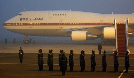 Chinese soldiers stand in formation in front of Japanese Prime Minister Yasuo Fukuda's plane after it arrived in Beijing December 27, 2007. Fukuda is scheduled to meet President Hu Jintao, top legislator Wu Bangguo and Premiew Wen Jiabao on Friday. [Agencies]