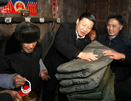 Xi Jinping (C), member of the Standing Committee of the Political Bureau of the Communist Party of China (CPC) Central Committee, distributes quilts and edible oil to local residents plagued by freezing weather in Yuping County, a Dong ethnic group residential area in Guizhou Province January 31, 2008. [Xinhua]