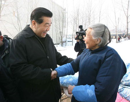 China's top political advisor Jia Qinglin (L) shakes hands with a senior resident in snow-torn Shucheng County of Anhui Province February 1, 2008. [Xinhua]