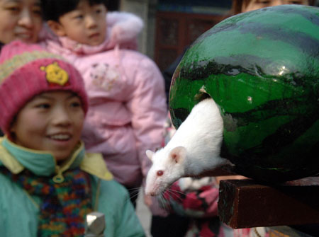 Childrens watch a white mouse performing during a training show on a temple fair in Zhengding of North China's Hebei Province, on the Lunar New Year, February 7, 2008, which is the beginning of the Year of the Mouse according to the lunar calendar. [Xinhua]