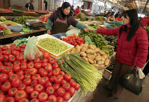 A customer buys vegetable at a market in Nanjing, Jiangsu province February 19, 2008. China's consumer price inflation surged to 7.1 percent in January, the highest level in more than 11 years, from 6.5 percent in December, the National Bureau of Statistics said on Tuesday.  [Agencies]
