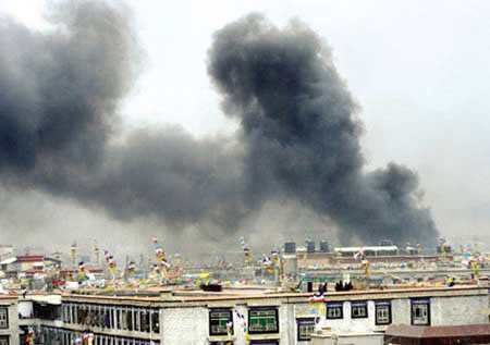Thick smoke billows into the air after rioters torched shops and houses in Lhasa March 14, 2008. [Xinhua]