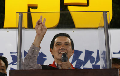 Taiwan's KMT candidate Ma Ying-jeou celebrates election victory in Taibei March 22, 2008. [Agencies]