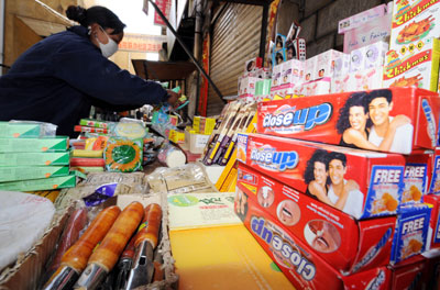 A woman arranges her commodities on the stand in a street in Lhasa March 23, 2008 as Lhasa returned to normalcy after the March 14 riots. [Xinhua]