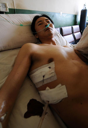 Ma Gubei is treated in a hospital in Lhasa in this March 16, 2008 photo. Ma was delivering food to hospital patients on March 14 when he was attacked by rioters and his motorbike was burnt. [Xinhua]