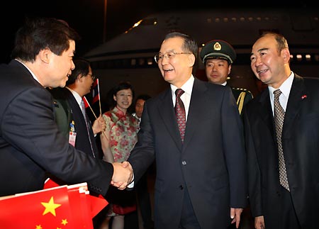 Chinese Premier Wen Jiabao (C) arrives in Vientiane, capital of Laos, March 29, 2008. Wen started his working visit to Laos on Saturday evening by the invitation of Lao Prime Minister Bouasone Bouphavanh, and he is also scheduled to attend the 3rd Summit of the Great Mekong Subregion countries in Vientiane. [Xinhua]