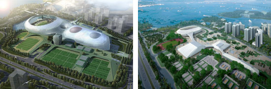 Artistic renditions of the Seashell (left) and the Spring Cocoon, designs for the Shenzhen Bay Sports Center. File photo
