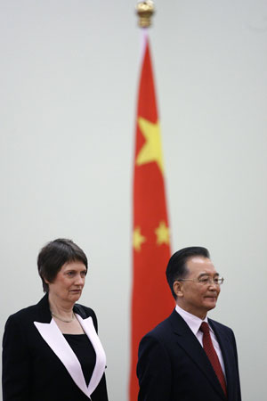 China's Premier Wen Jiabao and New Zealand's Prime Minister Helen Clark (L) listen to New Zealand's national anthem during a welcome ceremony at the Great Hall of the People in Beijing April 7, 2008. China and New Zealand signed a free-trade agreement (FTA) in Beijing on Monday, marking the first full trade treaty Beijing has concluded with a developed economy. [Agencies]