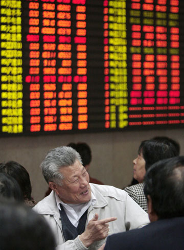 A man gestures in front of an electronic board showing stock information at a brokerage house in Nanjing, Jiangsu province April 24, 2008. China's main stock index soared over 9 percent in frenzied trade on Thursday after the government cut the share trading tax, seeking to boost investors' confidence. [Agencies]