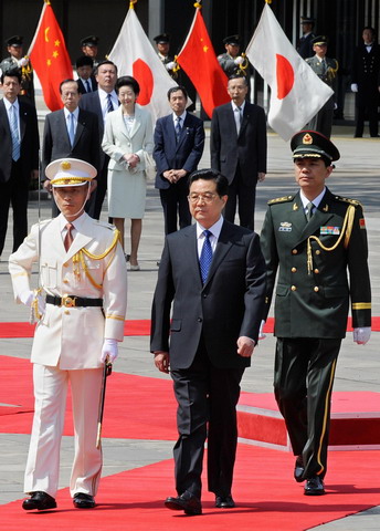 Chinese President Hu Jintao ( front C) is led by a Japanese soldier (L) as he reviews an honor guard while Japanese Prime Minister Yasuo Fukuda (background 2nd L) looks on during a welcoming ceremony at the East Garden of the Imperial Palace in Tokyo May 7, 2008. Hu is on a five-day visit to Japan. [Agencies] For More Photos