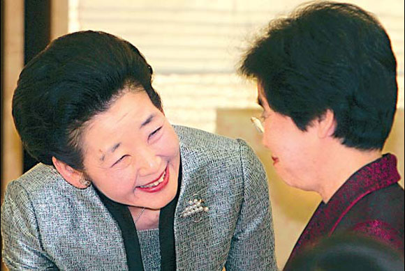 Liu Yongqing (right), the wife of President Hu Jintao, talks with Kiyoko Fukuda, wife of Japanese Prime Minister Yasuo Fukuda, during a dinner in Tokyo yesterday. AFP