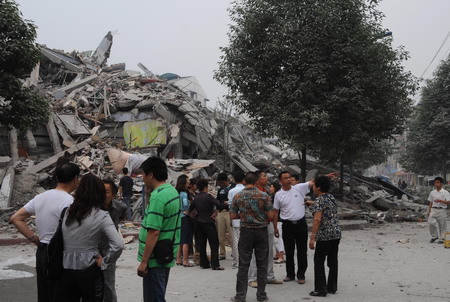 People stand next to debris in Dujiangyan, Sichuan Province, as eathquake have toren down buildings and caused major casualties in the city on May 12, 2008. [Xinhua]