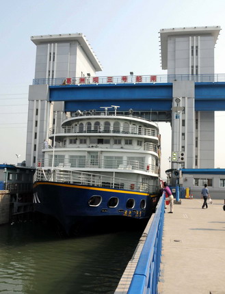 A large passenger liner passes through the Gezhou Dam in Yichang city of central China's Hubei province May 12, 2008. Gezhou Dam is another big dam on the Yangtze River 38 kilometers away from the upriver Three Gorges Dam. [Xinhua]