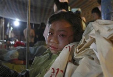 An injured student cries while receiving medical treatment near the debris of a collapsed building at Juyuan Middle School after an earthquake in Dujiangyan, Sichuan province May 12, 2008. [Agencies]