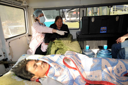 An American volunteer takes care of wounded people at an ambulance in Beichuan County, Southwest China's Sichuan Province, May 14, 2008. A 16-member team, organized by the US-based humanitarian organization Heart to Heart International, has come to the earthquake-stricken Beichuan County to help rescue the victims there. [Xinhua]