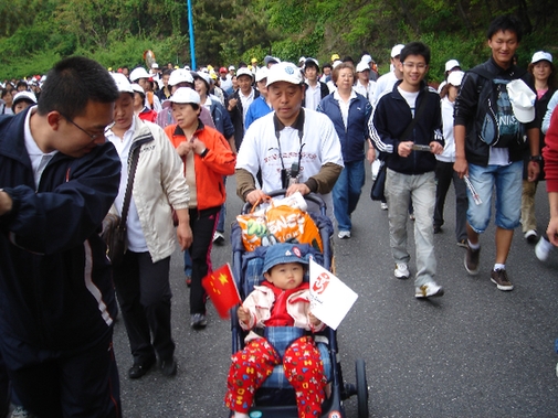 This morning, the pedestrians zigzagged the 30-kilometer-long Binhai Road along the sea beach. Tomorrow they will climb the 663-meter-high Daheishan Mountain in the city’s development zone.