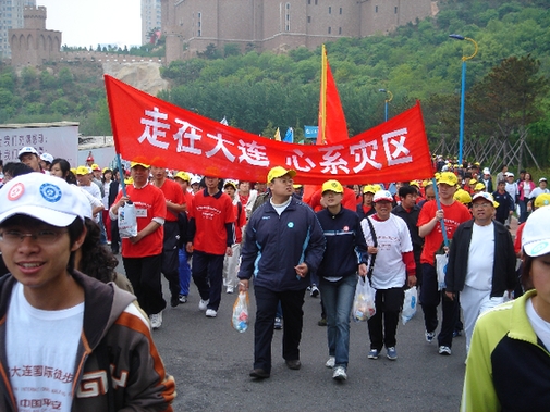 On the spot, Dalian Charity Federation and some companies sponsored donation for the disaster-hit areas in Southwest China’s Sichuan Province. Many pedestrians were wearing T-shirts with Chinese characters meaning “Wenchuan, hold on”. They donated and prayed for the people suffering the devastating earthquake this Monday.