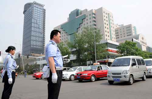 Traffic police in Taiyuan pay tribute to those who died in a massive earthquake May 19, 2008. A nation-wide ceremony was held on 14:28 on Monday, seven days after a massive earthquake hit Sichuan. [Xinhua]