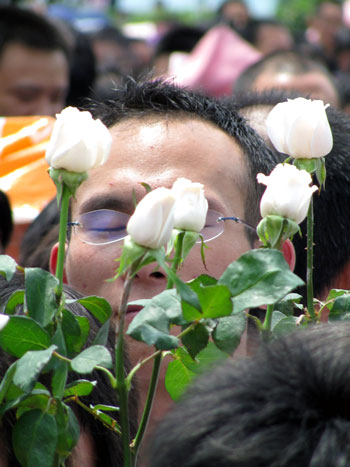 A mourner in Guiyang pays tribute to those who died in a massive earthquake May 19, 2008. A nation-wide ceremony was held on 14:28 on Monday, seven days after a massive earthquake hit Sichuan. [Xinhua]